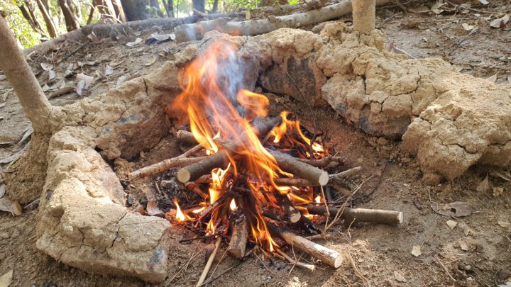 今回は枯れた細い竹の枝を束ね、ライターでしばらく火を当てて簡単に点火。火起こしがスムーズに進むと気持ちも上がります。