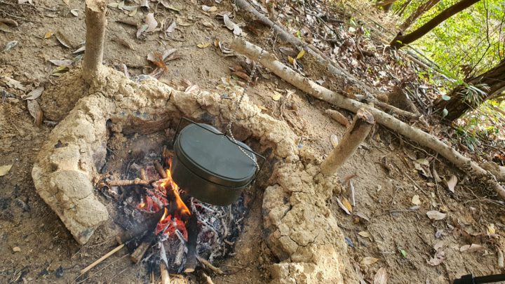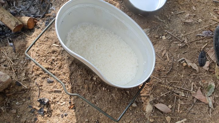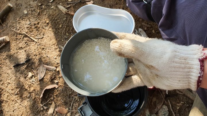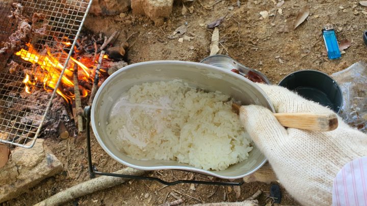 弁当箱に入れて持ってきた研いだ米と水を飯盒に移し、火にかけます。