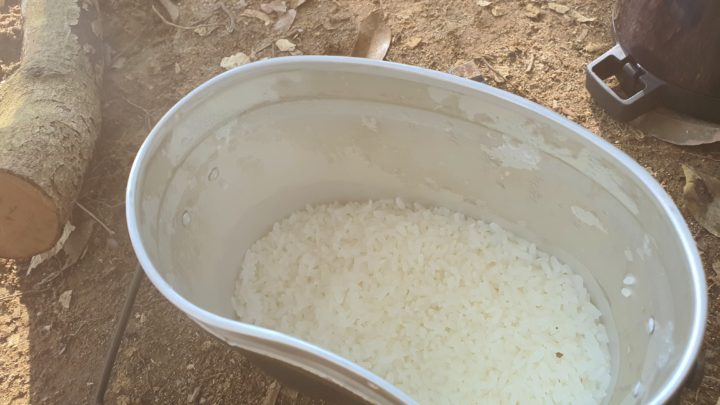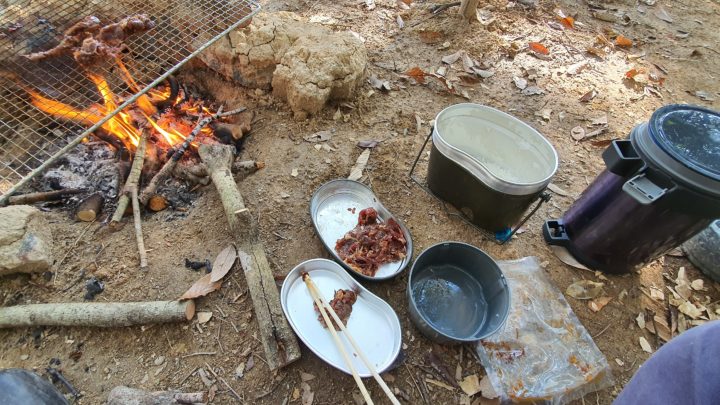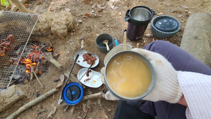 直火で炊いた米はふっくらとしていて美味しく、焼きたての肉との相性も抜群。ガスで作る料理より格段に美味しく感じられました。