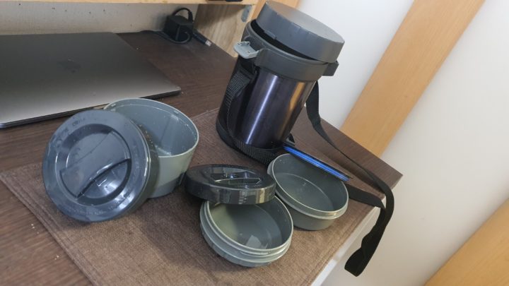 弁当箱はサーモス製。ご飯・汁・おかずをそれぞれコンパクトに収納でき、保温も可能な便利なアイテムです。