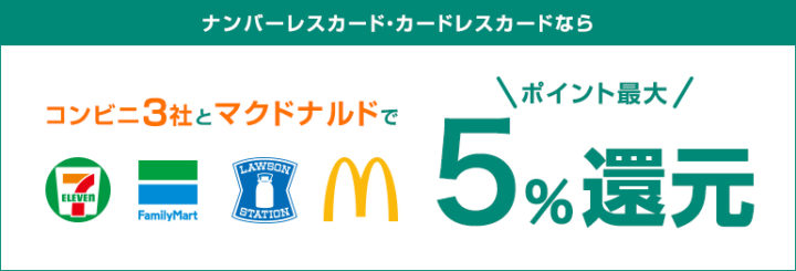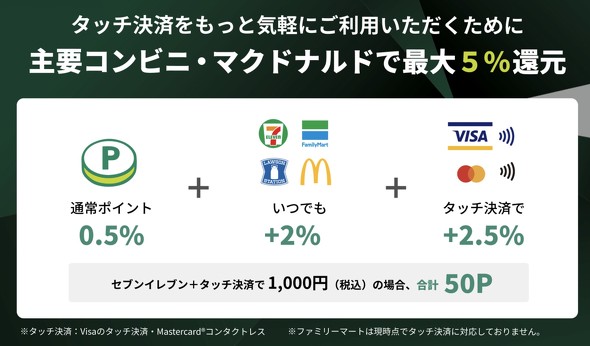 セブンイレブン、ファミリーマート、ローソンの3コンビニと、マクドナルドでタッチ決済すると、Vpointの付与率が5%とお得。