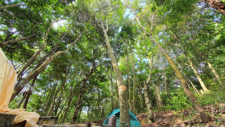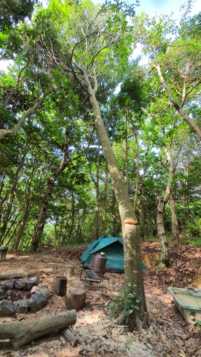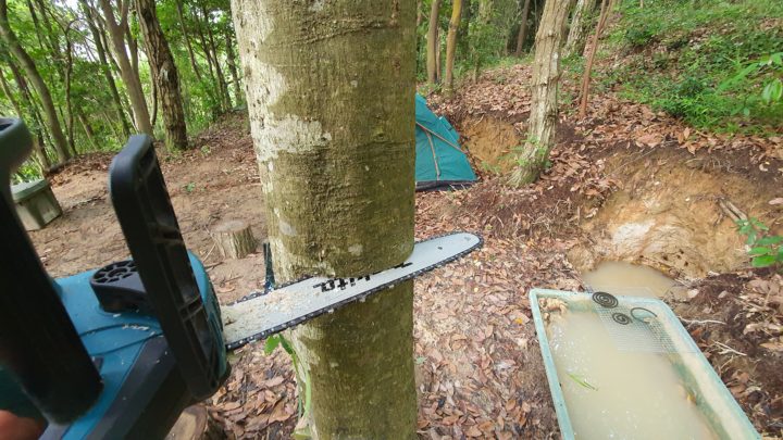 購入したタープは想像以上に大きく、設置場所の確保が課題となりました。山の中腹にスペースを作るため、木を一本切ることを決意。大きく育ったその木は、シンボル的な存在にもなり得るものでしたが、作業のためには切らざるを得ませんでした。