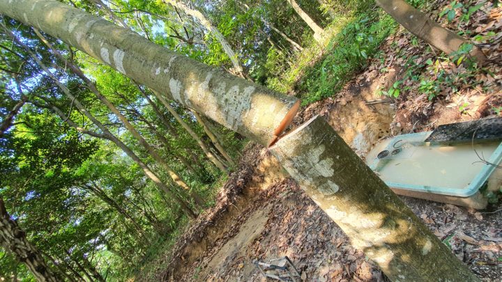木が傾くと、周囲の大木に支えられて倒れる途中で止まってしまいました。この段階で、作業を続けるべきかどうかを迷っていると、耳元で羽音が聞こえました。振り返るとスズメバチがすぐ背後に近づいており、慌てて山を降りました。