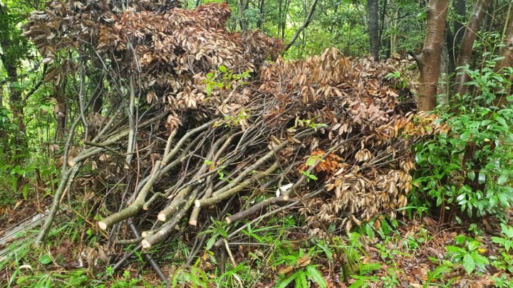 足元の茂みと、山を暗くしている細いが背丈のある木を切り倒した。作業の成果として、山に少し明るさが加わったように思う。木や茂みを切ったことで、広々と感じられるようになってきた。地道な作業の繰り返しだが、形として残る点が励みになる。