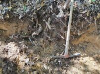 山の中腹の開拓作業続き 平地を広げる整地作業 今日も山の中腹で整地作業の続きを進めた。前回、右側の斜面はかなり進んだので、今回は左側全面をもう少し削り、余った土を低い部分に投げて地面を水平に整えていく。 今回の作業内容は、前回の延長にあたる。土手の壁面のやや高い部分を削り、低い部分に移動させながら、平地の面積を少しずつ広げた。 整地作業が進むと、低い部分の高さが少し上がり、その範囲も広がった。 蜂への注意 今日は蜂は姿を見せなかったが、大スズメバチが土中に巣を作ることがある。作業中は引き続き ...